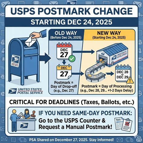 As of December 2025, USPS updated guidance in its Domestic Mail Manual to clarify what a postmark represents. It is now codified that a postmark reflects when mail is processed by USPS, not necessarily when it is dropped in a mailbox or handed to a postal worker.