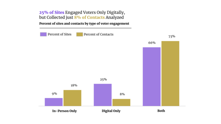 - Do commonalities exist between sites (such as mission or services offered) that correlate with engaging more contacts, the demographics of voters reached, or the turnout boost among voters?